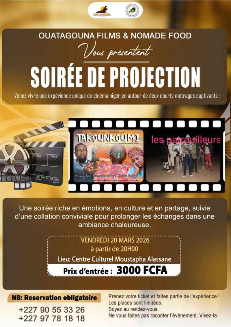 Le Centre culturel Moustapha Alassane accueillera, le vendredi 20 mars 2026 à partir de 20h, une soirée de projection proposée par Ouatagouna Films et Nomade Food. Au programme, deux courts métrages du cinéaste nigérien Boubacar Djingarey Maïga, figure montante du 7e art sahélien, qui explore avec finesse les fractures sociales et les résistances collectives de la région.