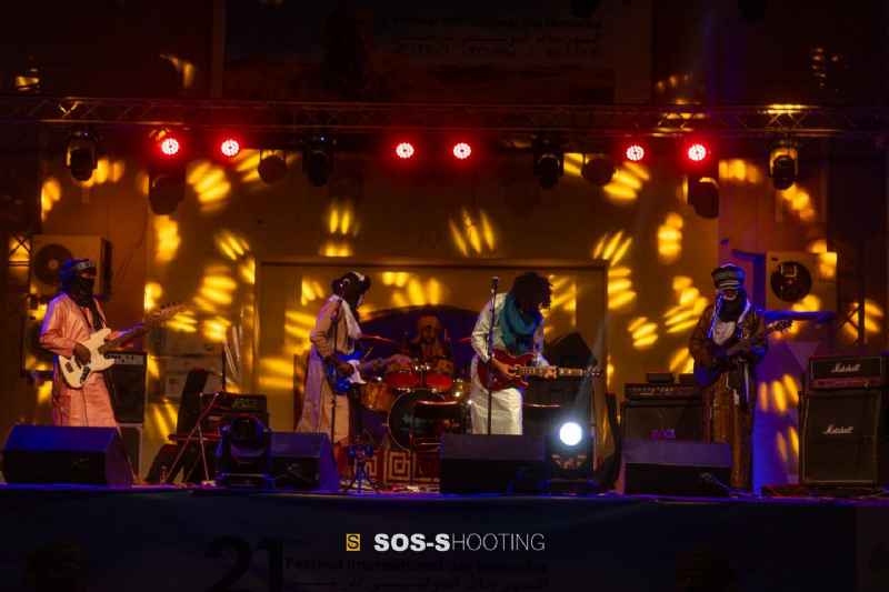On y retrouve plusieurs chanteurs, des guitaristes électriques, une basse, une batterie moderne et des percussions traditionnelles, auxquelles s’ajoutent parfois chœurs et danse. Cette organisation donne à Toumastine une présence scénique dense et collective, proche de l’esprit des campements nomades, où la musique est partagée, circulante et vivante.
